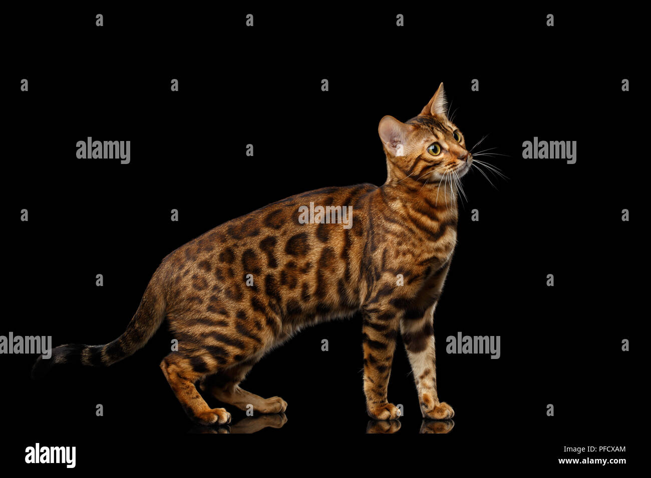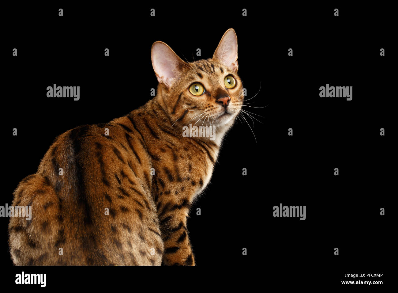 Close-up Neugierig Gesicht von Bengal Katze mit schönen Flecken auf dem Rücken, Sitzen, blickte mit Interesse, Isolierte schwarze Hintergrund Stockfotografie - Alamy