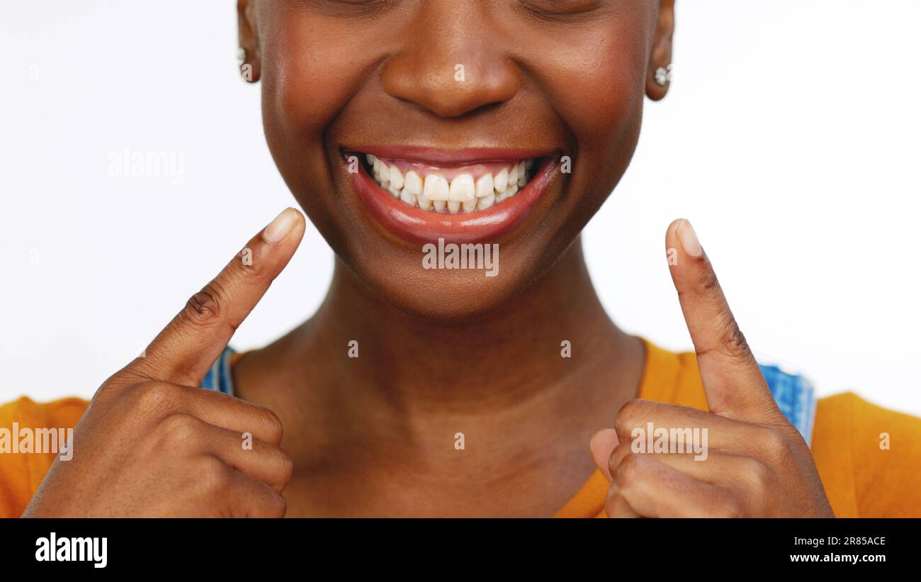 Glückliche isolierte afroamerikanische Frau lächelt für Zahn, Mund oder Zahnfleisch und Mundhygiene. Schwarze Frau, Zähne und Lächeln für Zahnpflege, Weißfärbung oder Stockfotografie - Alamy