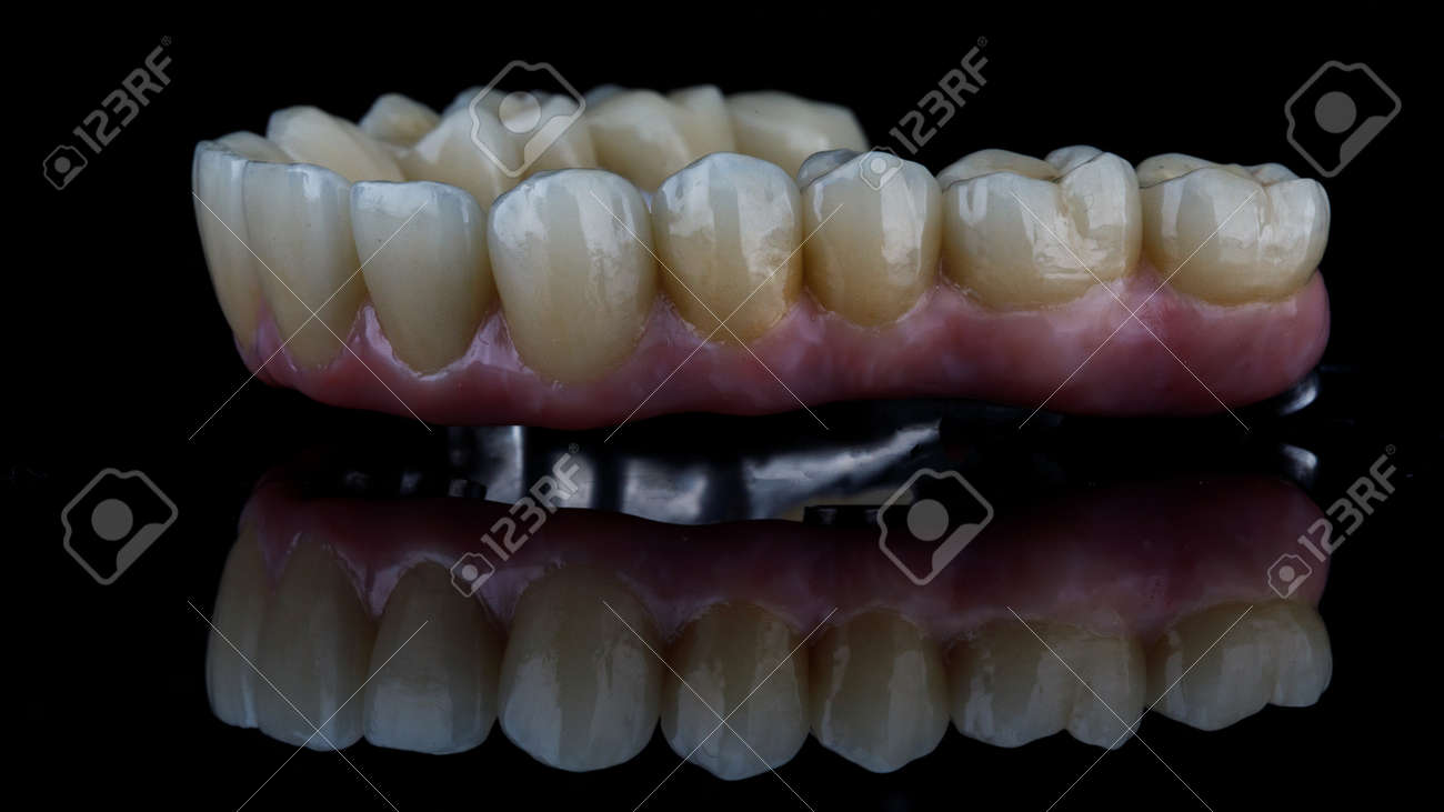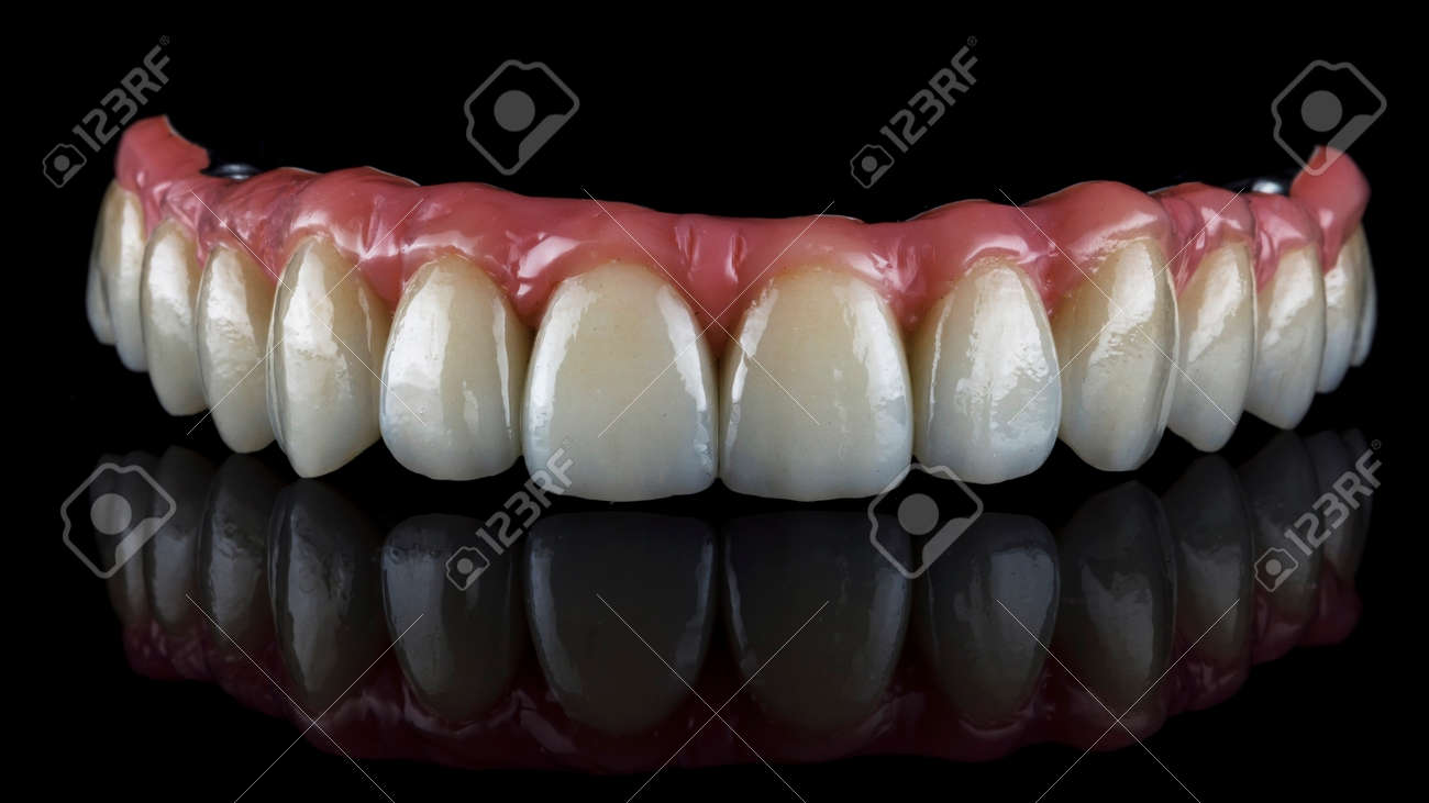 Zahnersatz Aus Keramik Und Rosa Zahnfleisch Für Den Oberkiefer Auf Schwarzem Hintergrund Mit Reflexion Lizenzfreie Fotos, Bilder und Stock Fotografie. Image 180475432.