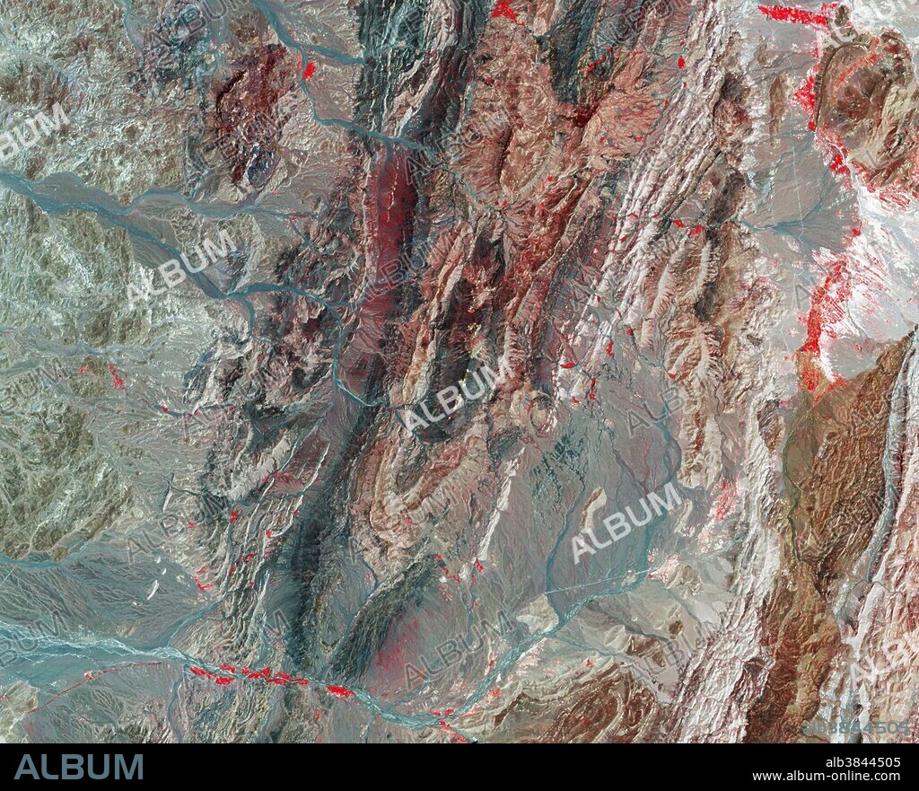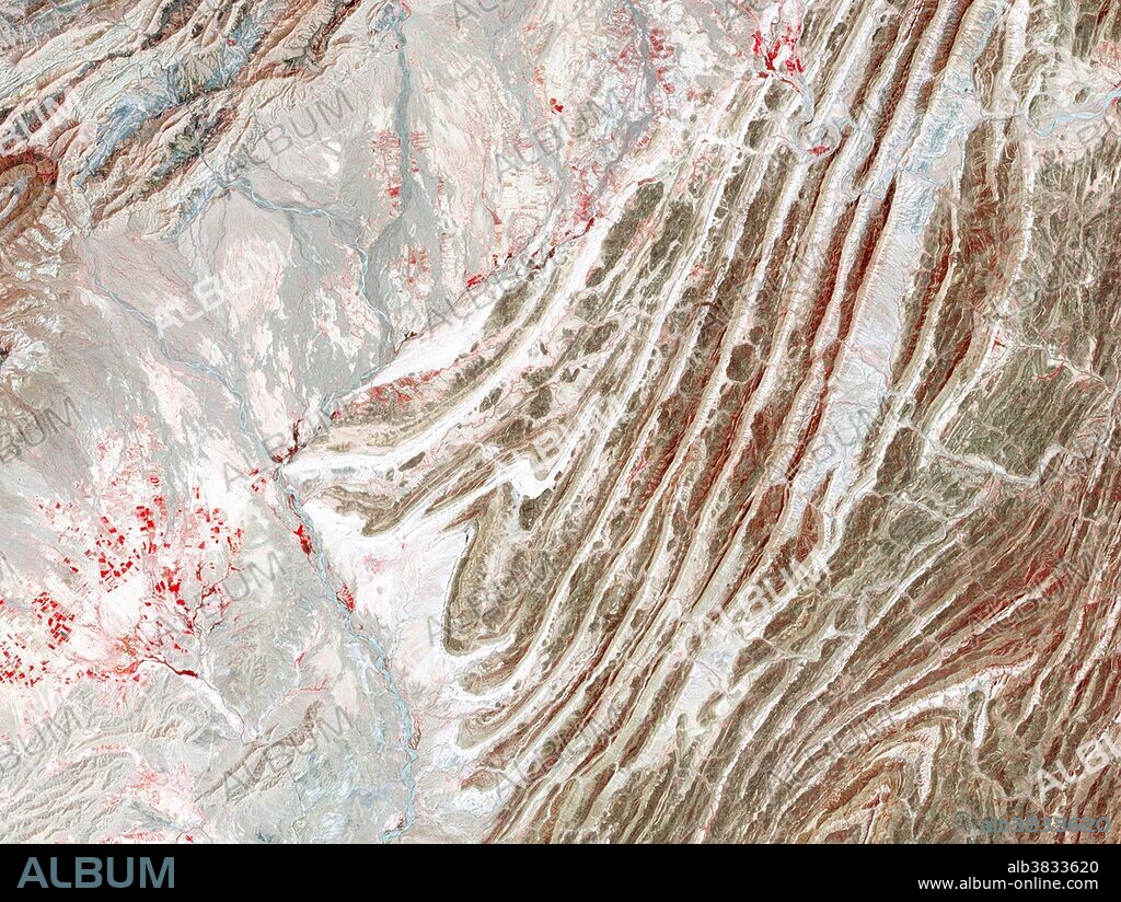 This image shows an imbricate fan to the east of Murgha Kibzai, Pakistan, in the Sulaiman Mountain Range. The fan is comprised of a series of parallel, closely-spaced slic - Album alb3833620