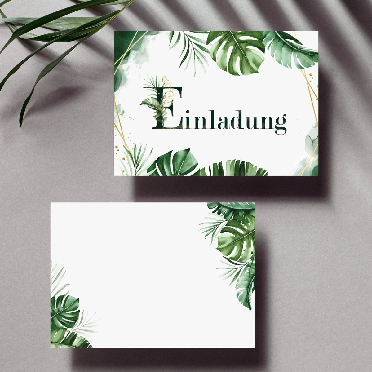 Geburtstagseinladung Save the Date Einladungskarte tropische Blätter grün | The Paperie Store