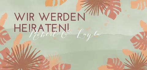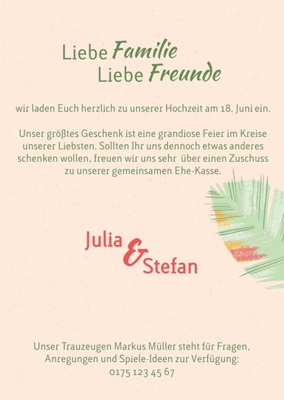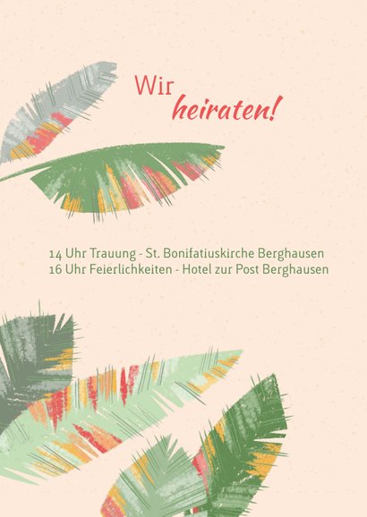 Hochzeitskarte mit abgerundeten Ecken und Palmenblättern