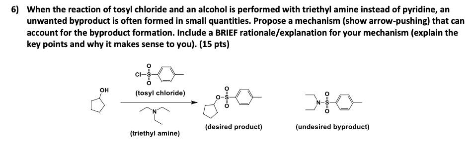 For this question we have to predict the major product of the above reaction. I included both the answer my prof gave and what I got, could someone explain please why my solution is incorrect? All my notes stated that tscl + pyr is for substitution. : r ...